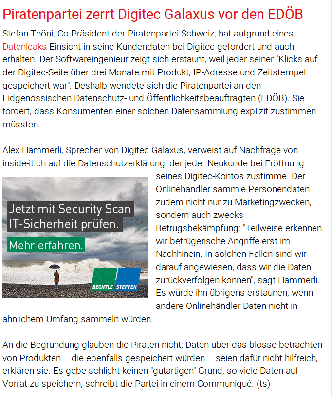 Der Onlineriese Digitec Galaxus speichert jeden Klick, jedes betrachtete Produkt jedes Kunden drei Monate lang. Diese unverhältnismässige Speicherung hat Stefan Thöni, Co-Präsident der Piratenpartei Schweiz, entdeckt und dem Eidgenössischen Datenschutz- und Öffentlichkeitsbeauftragten gemeldet. Stefan Thöni sagt dazu: «Wegen des Datenleaks habe ich Einsicht in meine Daten bei Digitec angefordert und staunte nicht schlecht, als dort jeder meiner Klicks auf der Digitec-Seite über drei Monate mi...